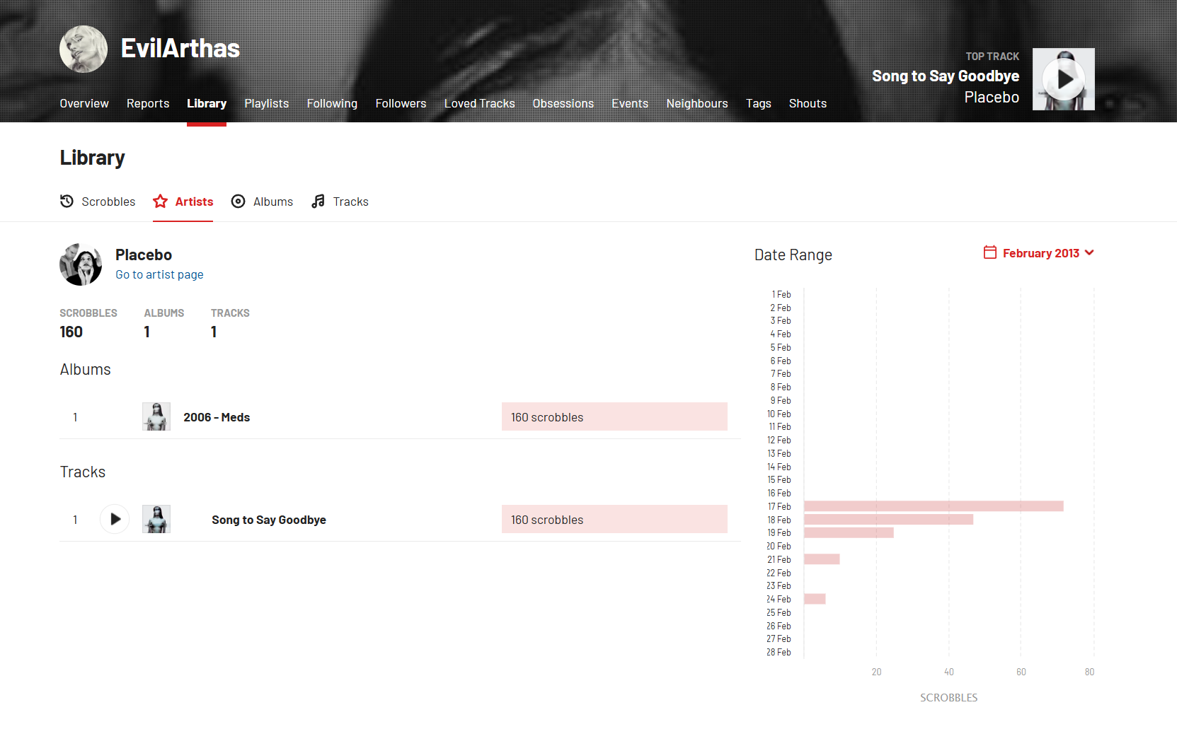Что случилось у папича в феврале 13 года, что он так много слушал эту грустную песню? Он весь день её слушал, а перед этим 16 февраля всего 4 скроббла на день. Делайте ваши ставки, по-моему, тут его тёлка бросила или что-то такое.