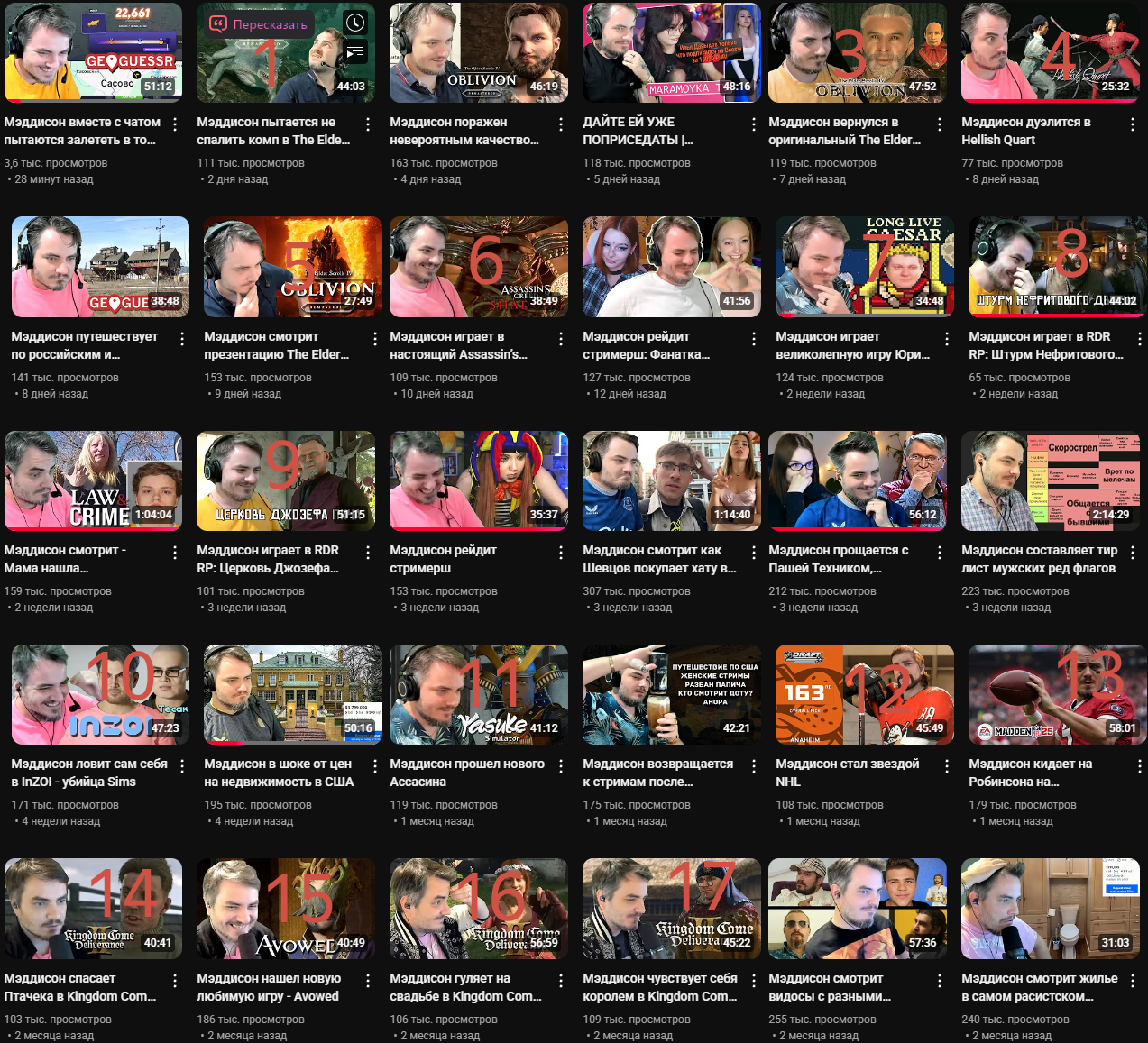 Анон, помнишь откуда Мэддисон начинал? С Рутуба в 2008 году. У него по прежнему остался канал на Рутубе где он 17-16 лет назад выкладывал свои первые видосы https://rutube.ru/channel/12064/videos/
