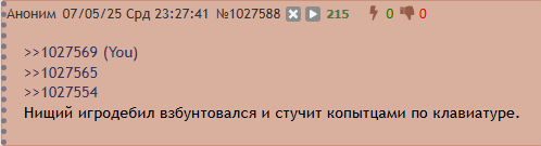 >>1024099 >ад в чате Ад был на вобле, когда боты спамили тупую хуйню Вот один из них, срущий такой хуйней по шаблону стабильно раз в 20-30 секунд А сейчас там соя рвется, что их игру миллионолетия кто-то плохо оценил. Ну хотя бы кто-то кроме ботов