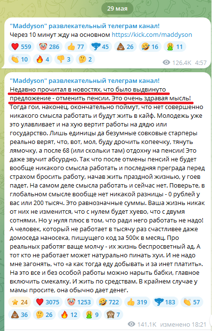 Гоблина вон заставили перейти на Рутуб, но одного Гоблина мало. А чем Мэдддисон лучше? Ничем. А если Мэддисон не хочет переходить на Рутуб то он что не патриот что ли? Мэддисон жалуется на то что просмотры упадут. Так ты работай, выкладывай интересные ролики на Рутуб, и количество подписчиков станет много. Все начинают с малого, это естественно. Как поработал так и заработал. Нужно поддерживать отечественного производителя. А если этого не делать и никого принудительно туда не загонять, тогда Рутуб никогда не станет заменой Ютубу. Гоблин Пучков после удаления его канала с Ютуба успешно занимается импортзамещением. Его канал набрал уже почти 600к https://rutube.ru/u/goblin/ значит можно набирать нужное количество просмотров и подписчиков. Просто Мэддисону лень этим заниматся. Но главное что раскрутить канал на Рутубе МОЖНО. Пучков смог, значит и Мэддисон сможет.