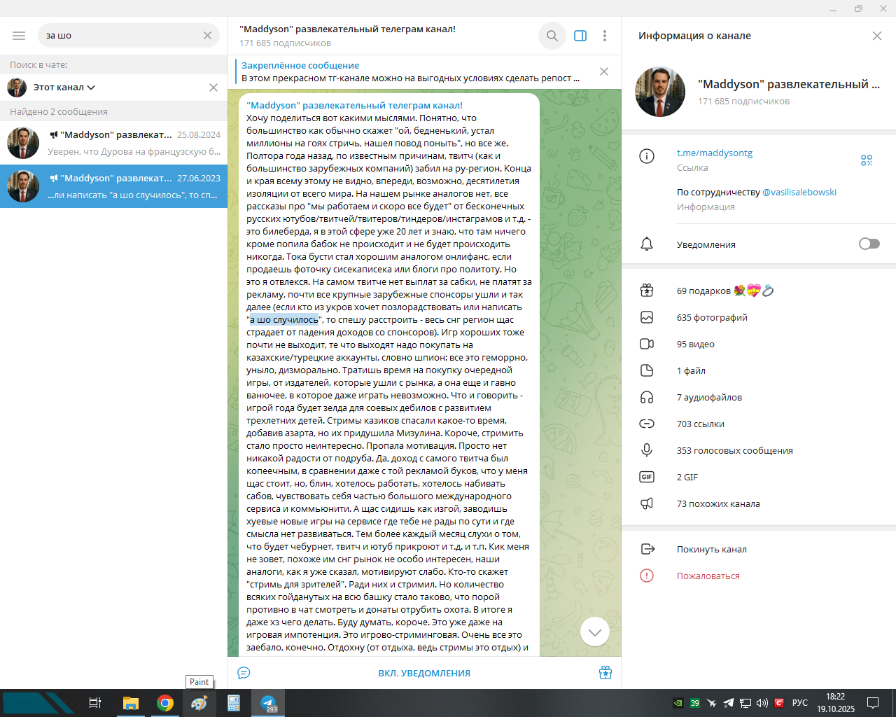 https://t.me/maddysontg/5023 >1:11 стримить ради рекламы 2 раза в неделю я не прекращу. Нужно отстримить еще 17 стримов, а после этого совсем НАВЕРНОЕ в радио молчание. ЕСЛИ конечно не появится какого нибудь ИНТЕРЕСА к стримерской деятельности.