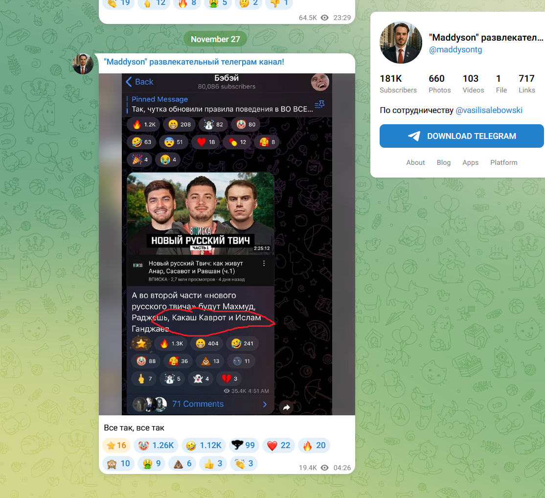 Он сказал что если под этим голосовым https://t.me/maddysontg/5034 какой то значок эмодзи наберет больше голосов чем клоун, то буду играть в игры или смотреть нейрохрючево, и 172к проголосовало за значок говно, 146к проголосовало за клоуна, а 118к за сердце. Если подумать то: 146к за клоуна это хейтеры. 118к за сердце это фанаты. 172к это скорее всего просто тролли, но думаю часть их них фанаты. То есть фанатов не поленившихся что то сделать в России у него получается около 150-200к если считать сердце и часть значков говно.