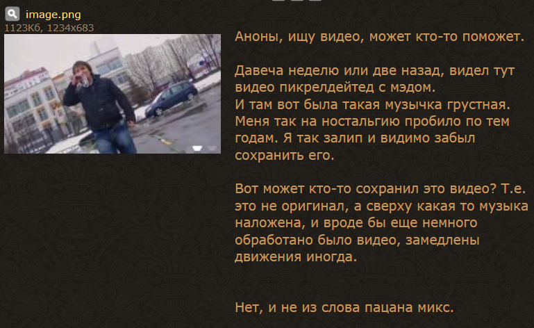 >>1081827 >А що не так? >що >що Я уверен что этот пост сам Чмодьё писал. В 2022-2023 годах он на стримах вместо "что" иногда говорил "шо" или "за шо". Я тогда несколько раз это видел, и думаю это заметили все кто наблюдали за его стримами. Мне лень тогда было записывать где он так говорил, поэтому у меня осталась только одна запись на каком стриме он сказал "за шо". Стрим назывался "Мэд сербский стрим из Москвы." и на нем он говорил >1:05:00 за шо Но этот стрим удалили с ютуба. Возможно он остался у кого нибудь.