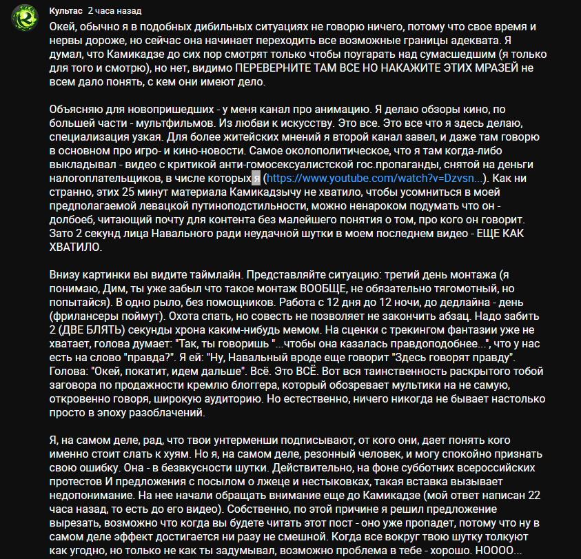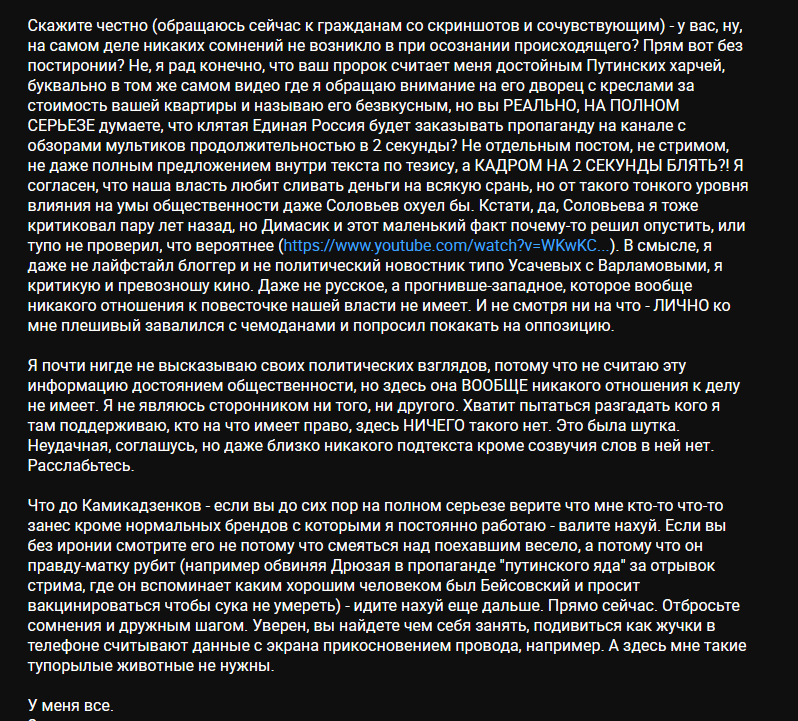 Мне одно не понятно. Что он крчит про каких то кремлеботов, про скрутку лайков, про удаление подписок и прочего