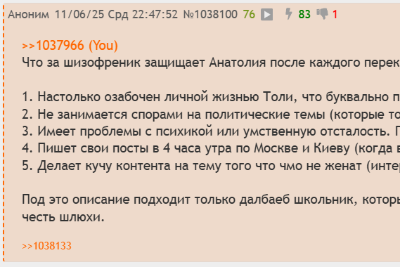 Что за шизофреник защищает Анатолия после каждого переката треда, догадаться очень просто. Это человек, который: