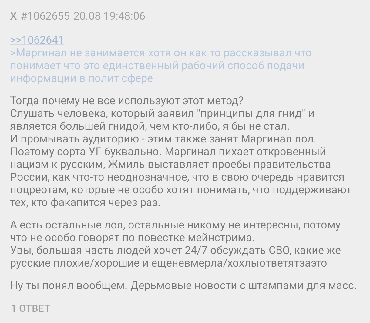 Выражу крайне редкое мнение в подобном треде хейтеров. Хотя я тоже хейтер Жмиль - это притягательный адекват из зет-тусовки. Если не вдаваться в нюансы его позиции, если не смотреть на то, что он изначально монетизировал функцию прибухнуть и все эти его сомнительные "аукционы", и уж если не следить за его личной жизнью, чему в треде посвящено 90% обсуждений, он - один из самых приятных в зет-лагере. И на фоне сегодняшнего гостя(Михаса) это прекрасно видно. Можно, конечно, завернуть что-то вроде "уж не больно сложно быть адекватом среди такого...", но я воздержусь. Во многом потому, что зет-лагерь говорит те же самые слова о своих политических противниках.