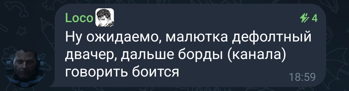 >Поэтому твой совет как раз и похож на шизов, которые задают тейки, где "добровольно записываю себя в когорту психически-больных" >Иначе бы они вели себя достойнее кмон. >Жмилю есть, что предьявлять, в том числе и за его патриотичную позицию. Если начну подымать тему сходки, что есть беспросветная тупизна, уж простите - я закопаю себя ещё до начала разговора буквально. Перечитай мой пост. Попробуй уловить то что сказано между строк, а вначале поста прямыми словами