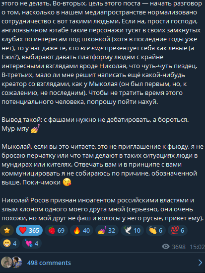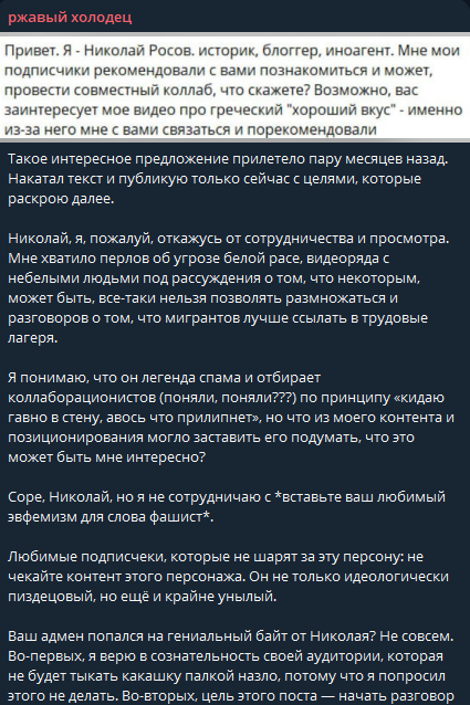 > Уточняйте, когда имеете ввиду кого-то конкретного и год задержания. После 2022-го в России тебя задержут даже с пустым листком А4-формата https://youtu.be/TmSsIRLAIpw?si=16E1FO3oLw52g7u2 > Непонимаю о каком мутном типе ты говоришь, который раскидывается деньгами. >У Росова ВСЯ ЕГО ЖИЗНЬ - это буквально интернет-карьера. Живёт он, как аскет, что подтверждают девушки, которые были у него дома. Молодой человек заперся у себя в комнате, тратит все деньги на свою деятельность, постоянно грезит о новом мировом порядке, сводит все контакты с внешним миром только до необходимого минимума по рабочим вопросам. Таких людей могут называть радикальными фанатикам, но мы называем его просто Николаем Росовым