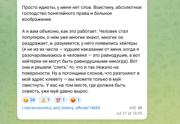 >у него появились хейтеры (я не из их числа — худшее наказание от меня, когда я разочаровываюсь в человеке — это равнодушие, а вот хейтерки не могут быть равнодушными никогда) Пустые слова. "Я бы не стал так делать потому что я не злой". Ну ок.
