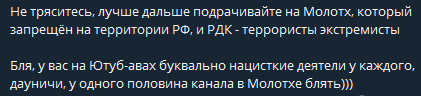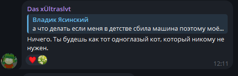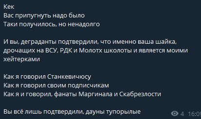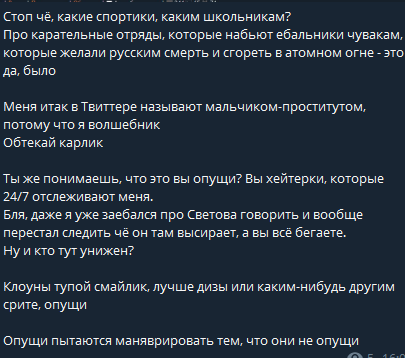 >Другие круглые идиоты заявили, что я "не должен был смотреть это видео". Не по понятиям. Ну сармат посмотрел, например, но не стал открыто подсвечивать, что это скабр, повёл себя по людски. А кто-то повёл себя странным образом.