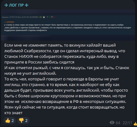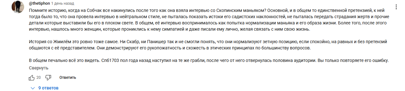>>1052718 Смотри в описание к тому видосу, что я кидал — там ссылка на оригинальный стрим. Там, где вся эта клоунада в прямом эфире. Дата есть — глянь хронологически соседние трансляции, там всё по нарастающей. А если хочешь прям по косточкам и в деталях — залетай в его “ля шатнула банана” (чат в тг). Только не тупи, доступ туда за донат, и лучше заранее спроси прямо на стриме, как это сделать — потому что в интернете 60% гениев ошибаются даже в элементарном. Дальше — ищи олдов. Те, кто сидит с ним со времён до Пичи. Лучше в лс, потому что за обсуждение “Что случилось с его старыми донатерами?” можно и в бан слететь — инфа токсичная. А теперь сам сюжет: Когда у Скабра был замес с Иваном-пидарасом, начался лёгкий хайп. Его стали заказывать Маргиналу, вкинулся и Пича — один из самых преданных донатеров. А потом всё пошло по отработанному сценарию: сначала гыгы, потом травля, потом смерть перса (в прямом и переносном смысле).