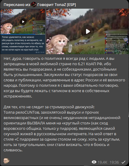Пиздец, тупо тред одного семена, психбольного жирного птушного курьера хуиштофа, который набивается в друзья донатами по 100 рублей к каждому нижнему интернет селебрити и какает "политической аналитикой" по хойке и старым видео нестермана. А на карела он срет по простой причине что говништоф в своих видео напиздел на несколько статей и теперь пытается строить из себя z-патриота. Скабр то, скабр се, просто ёбнутый обиделся что жирный тупой карел его засрал на видео и теперь 24/7 серфит в интернете любую инфу про микроселебрити.