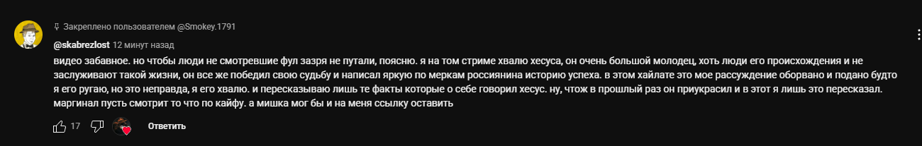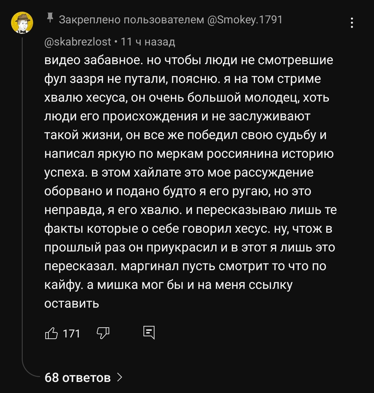 Заметьте как Сармат отреагировал на деанон. Он знает кто такой скабр, он наверняка узнал его (в конце в рекомендованных сразу же выскочил ебальник скабра + сам видос называется скабрезлость в молодости), но всю дорогу он сидел с покерфейсом и делал вид что не понимает что это и зачем ему это заказали. Не потому что он реально не понял, что это докс скабра, а просто из солидарности, чтобы не гадить рандомному хую без причины.