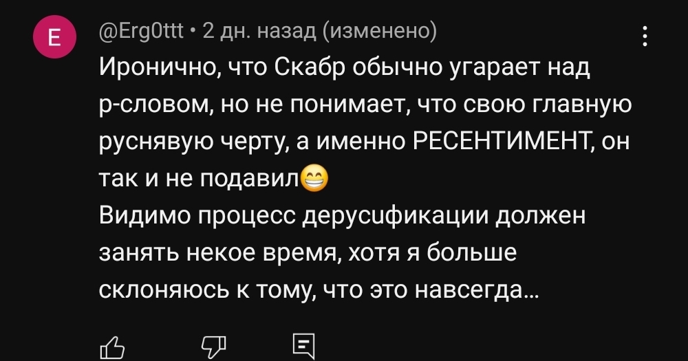 Нахожу ироничным тот факт, что малютка Скабрик, выехав из так ему ненавистной Говноматрасии, стал гораздо тщательнее фильтровать базар и соответственно стал на порядки более скучным хуесосом. Раньше ему душка хватало рофлить про хахлов и чуррос, а теперь присутствует трясочка по поводу того чтобы не пукнуть лишнего про чубатого господина. Пи факту ваш толстый карельский опарыш стал говорить проукраинское за денюжку - и он очень старается делать вид что не презирает хохлоскот, хотя все мы знаем как он к ним относится.