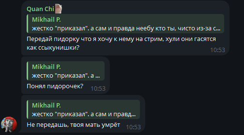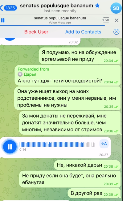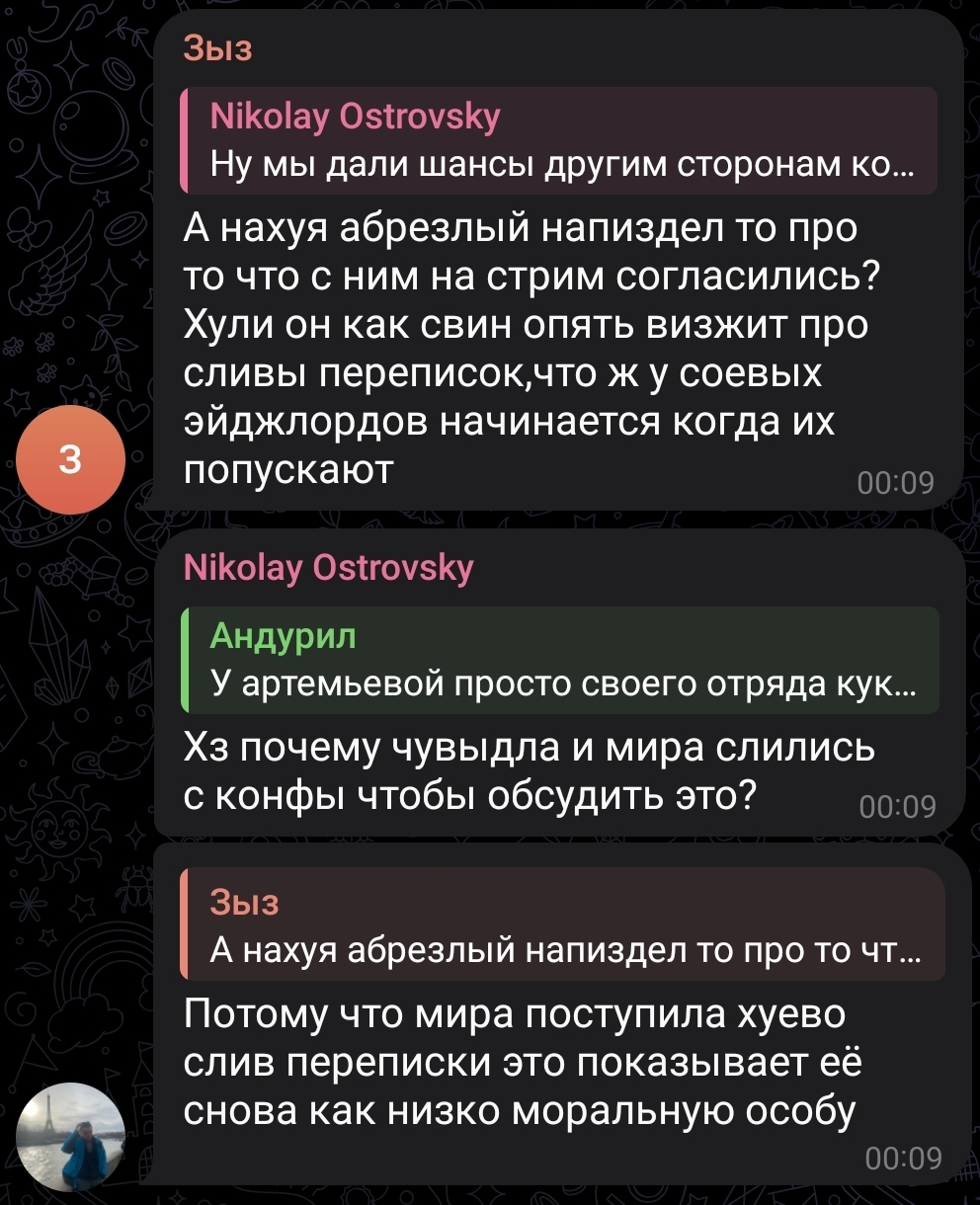 Еврейский шизофреник островский и руснявый дегенерат Остапов анонсировали стрим с Чувыдлой и Мирой Остролист, на который они не соглашались. В ответ на это Мира выложила переписку, где однозначно писала, что на стрим с конфой и Дарьей Артемьевой она не придет. В ответ на это смоленская свинья подняла визг, что его ЛиЧнУю ПиРиПиСьКу слили, а островский на кой то хуй начал пиздеть, что договоренности были.