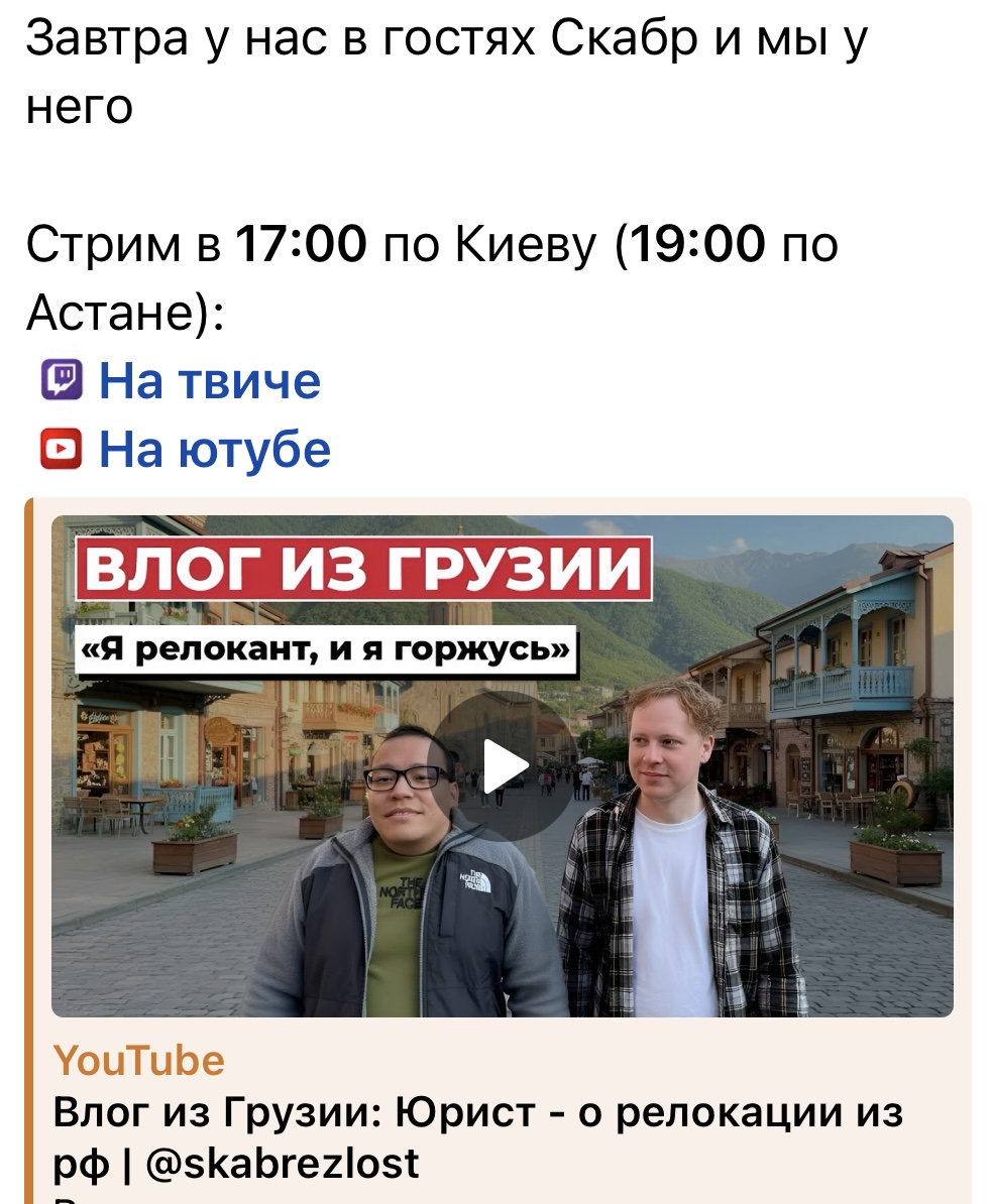 Не слушайте Скабра. Не пишите грузинским ментам. Задача достучаться до грузинских инфлюенсеров. Его должны дотащить до границы с РФ (южной осетии) вигеланты, а не мусора. А там его уже примут погранцы, сымитировав, что он сам незаконно пересек границу (из Грузии в Южную Осетию)
