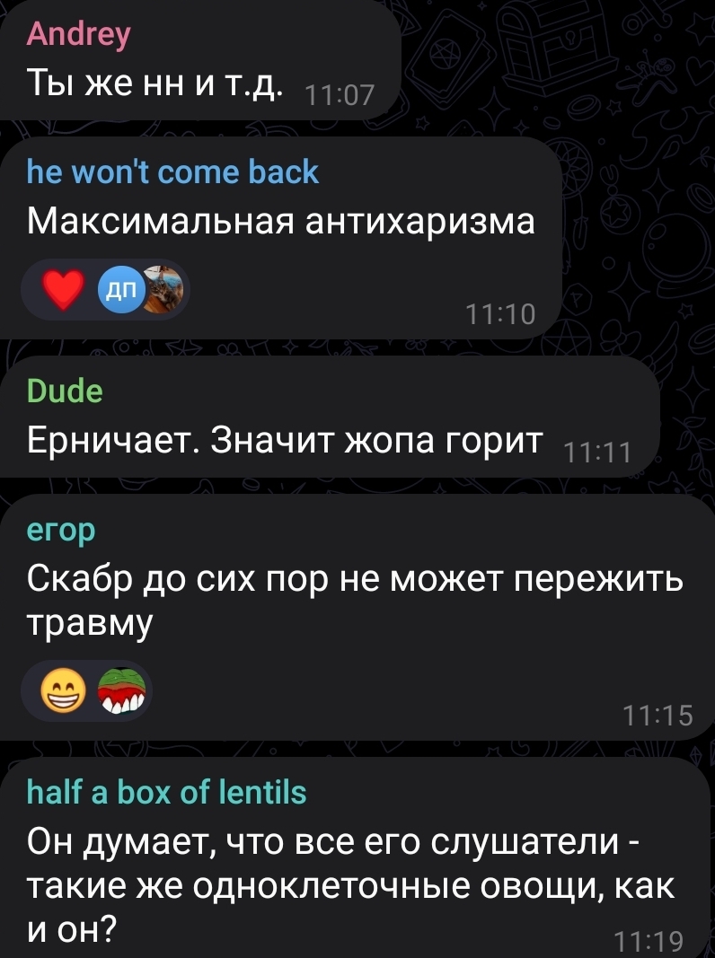 Скабрик пытается не палиться, что каждый час чекает этот тред, но выдает себя, используя фразеологизмы отсюда.
