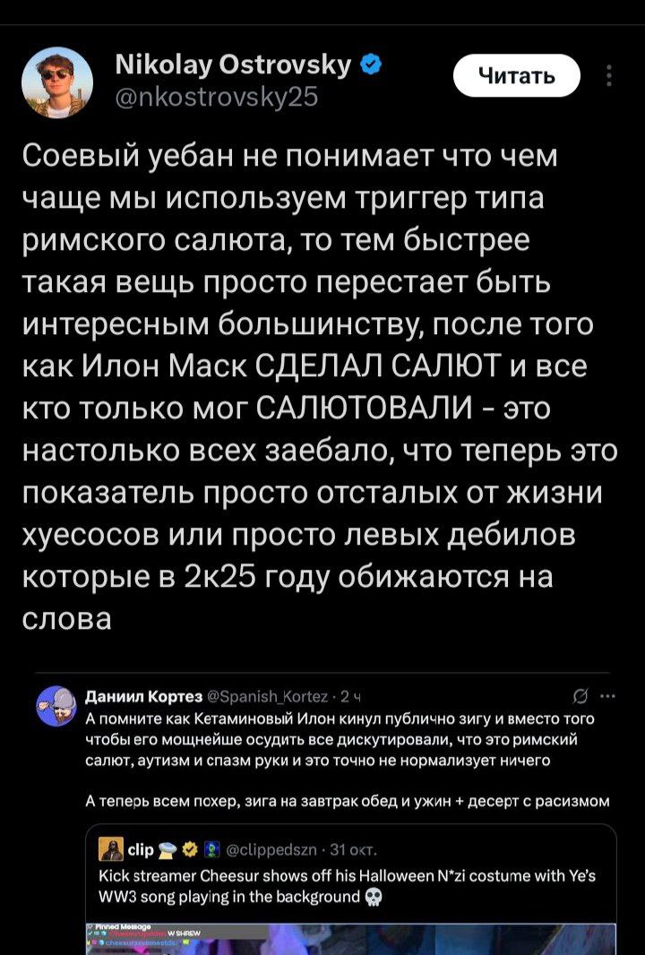 Вигелакнтов погромщиков координируют местные оппозиционные депутаты и те, кто сейчас воюют в Украине, поэтому нужно достучаться до них, а не до ментов. (Я уже заказал озвучку перевода его тейков на грузинский язык) Он сам себе задонатил вопрос про синдром Пфайфера у грузинских детей - это можно отследить, увидев списание с его карты в момент, когда к нему залетел донат. Скиньте Островскому @yt17gothgf_bot три видоса, где засирает грузинских детей, грузинских баб, и чмошных таджиковидоых грузинских мужиков. + мем про терпильность Скабрика.