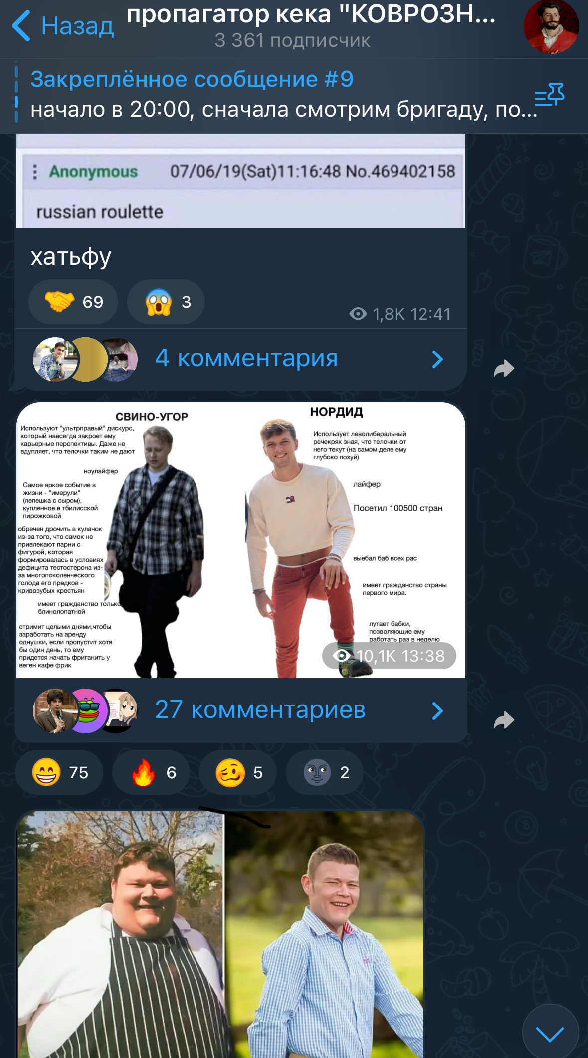 >>1074753 → узнал о нем из хайлайта маргинала зимой 2024, когда видимо пича его закидывал ему чтобы пропиарить, он там более-менее смищно стелил и решил чекнуть. В итоге понравилось и остался. Зима 2024 вообще была ахуенно, по второй очереди (10р/минута) можно было заказывать видео по 2 часа, а потом анальный сдох и с этого рофлили, а потом с дохлохо деда фрикартофеля, эх, золотые временя сука...