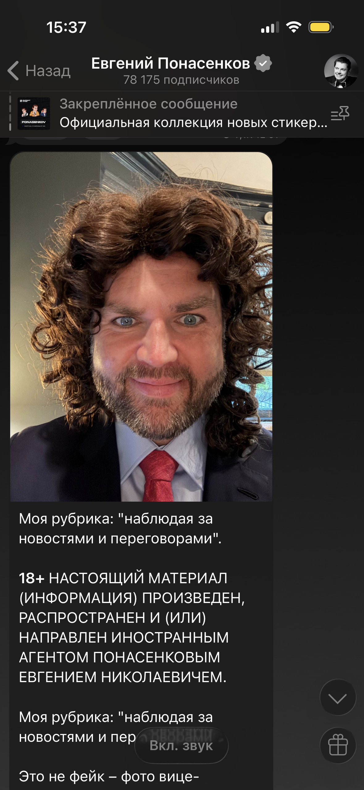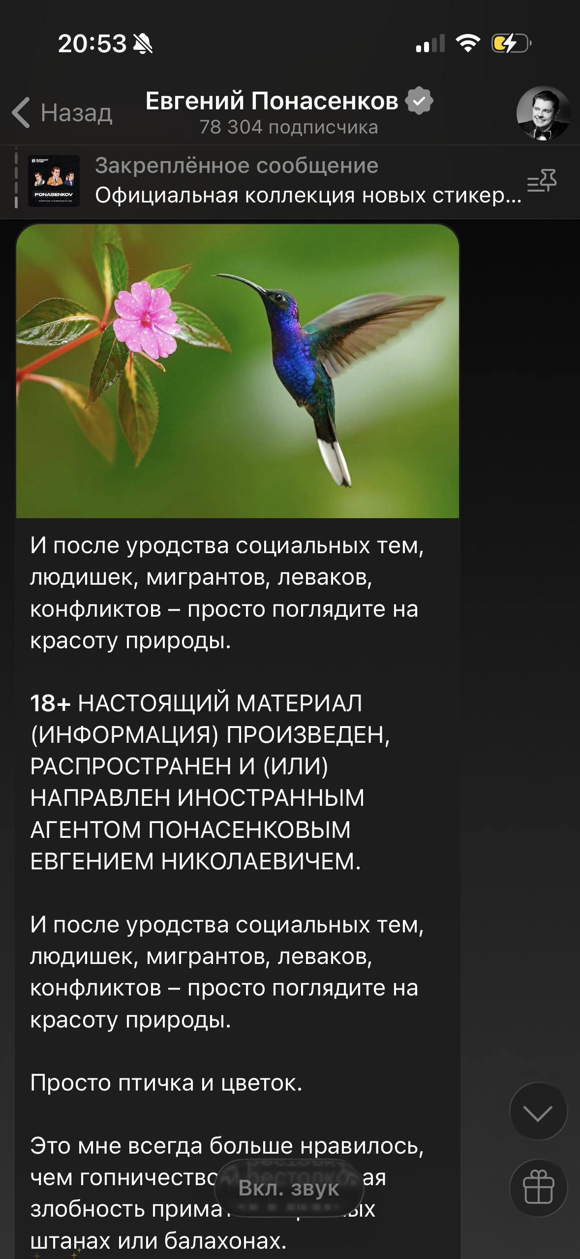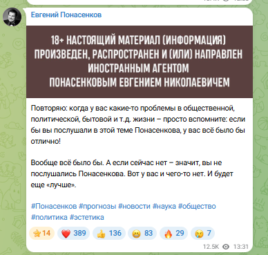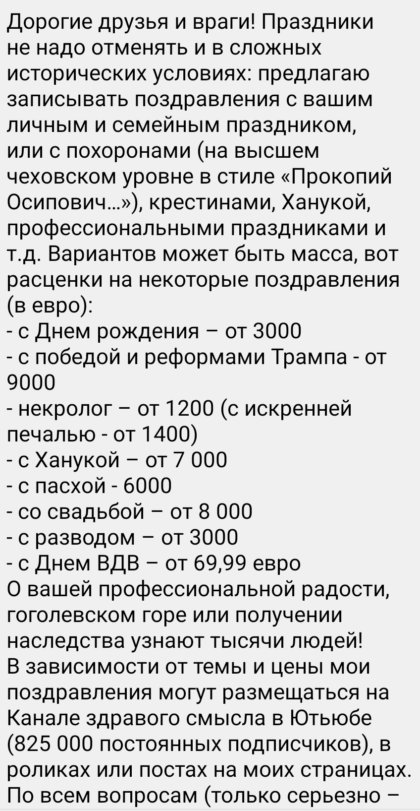 "Я такой бедный, мне так хочется всем помочь, но я сам под страшными репрессиям, поэтому хожу по ресторанам и как могу сподвигаю на донат, чтобы помочь голодающим, т.е. исключительно себе. Ведь если я не буду ходить по ресторанам и ездить по Европам, я не смогу создавать для вас науку и искусство"