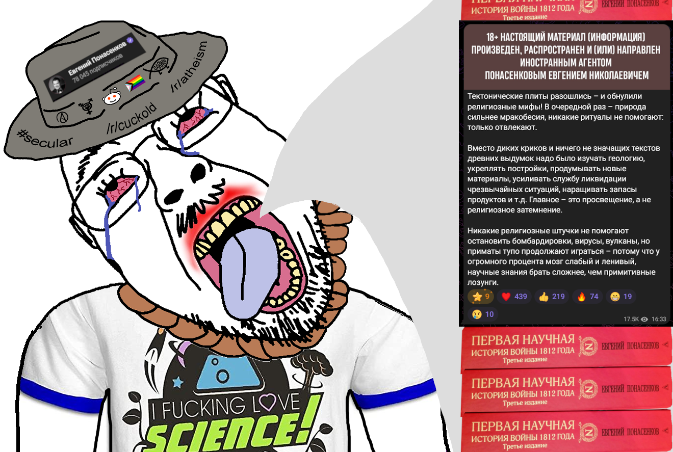 Легендарный маэстро Евгений Николаевич Понасенков, ведущий специалист по Наполеонике в России, уничтоживший маньяка-плагиатора олега ссаколова, собравший уникальную коллекцию дилдо и всех ДНК-ошибок в природе, ставший кумиром молодёжи XXI века, не нуждается в представлении, но я попробую: