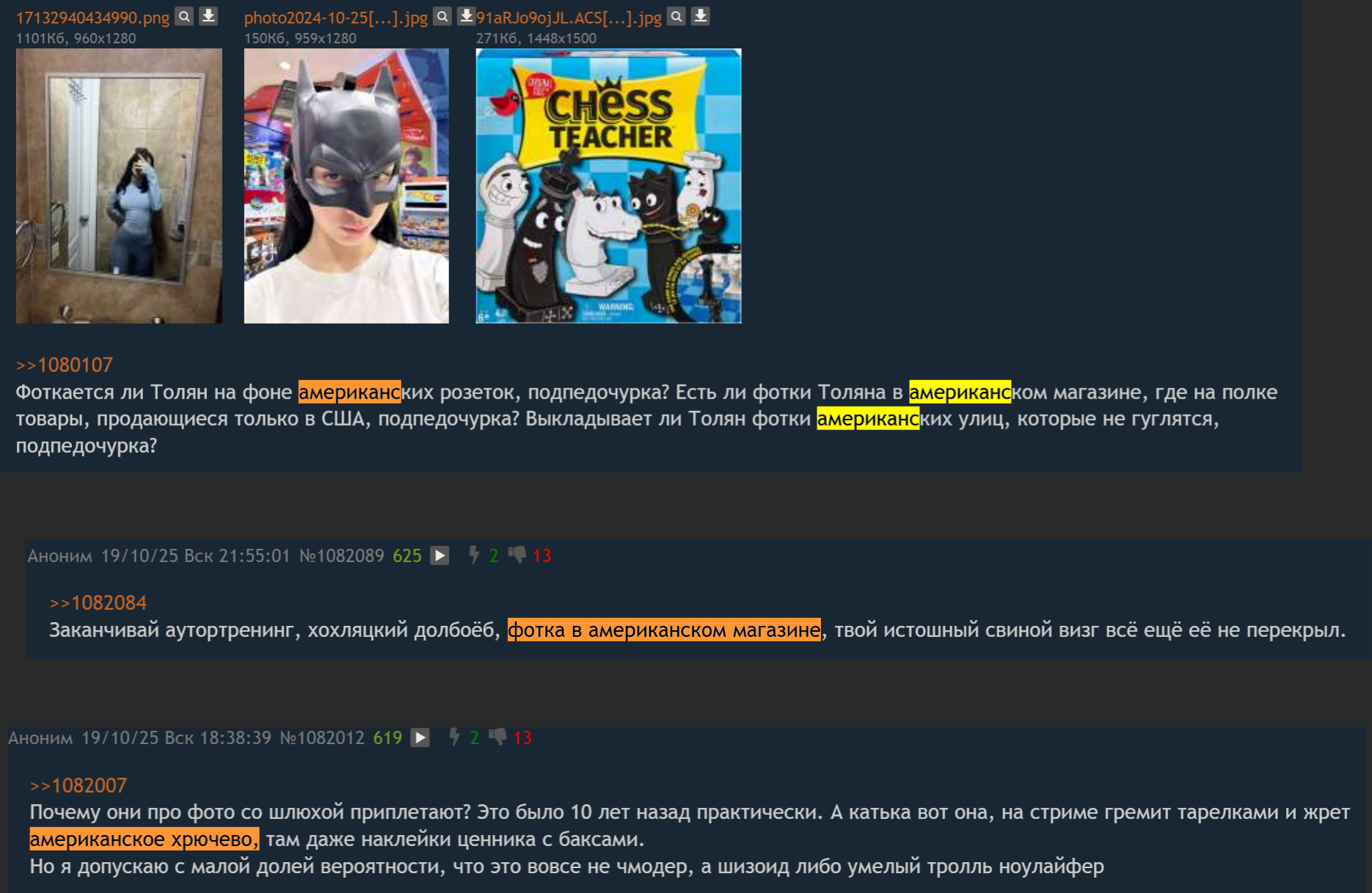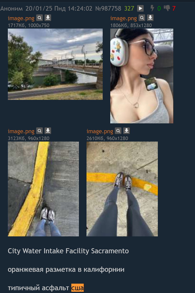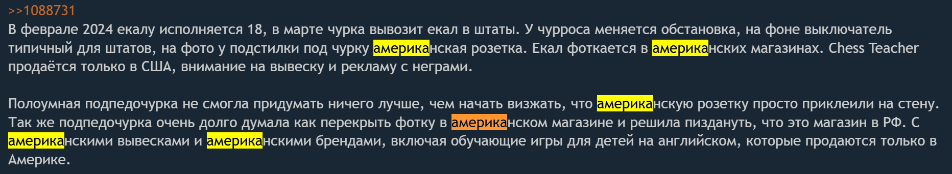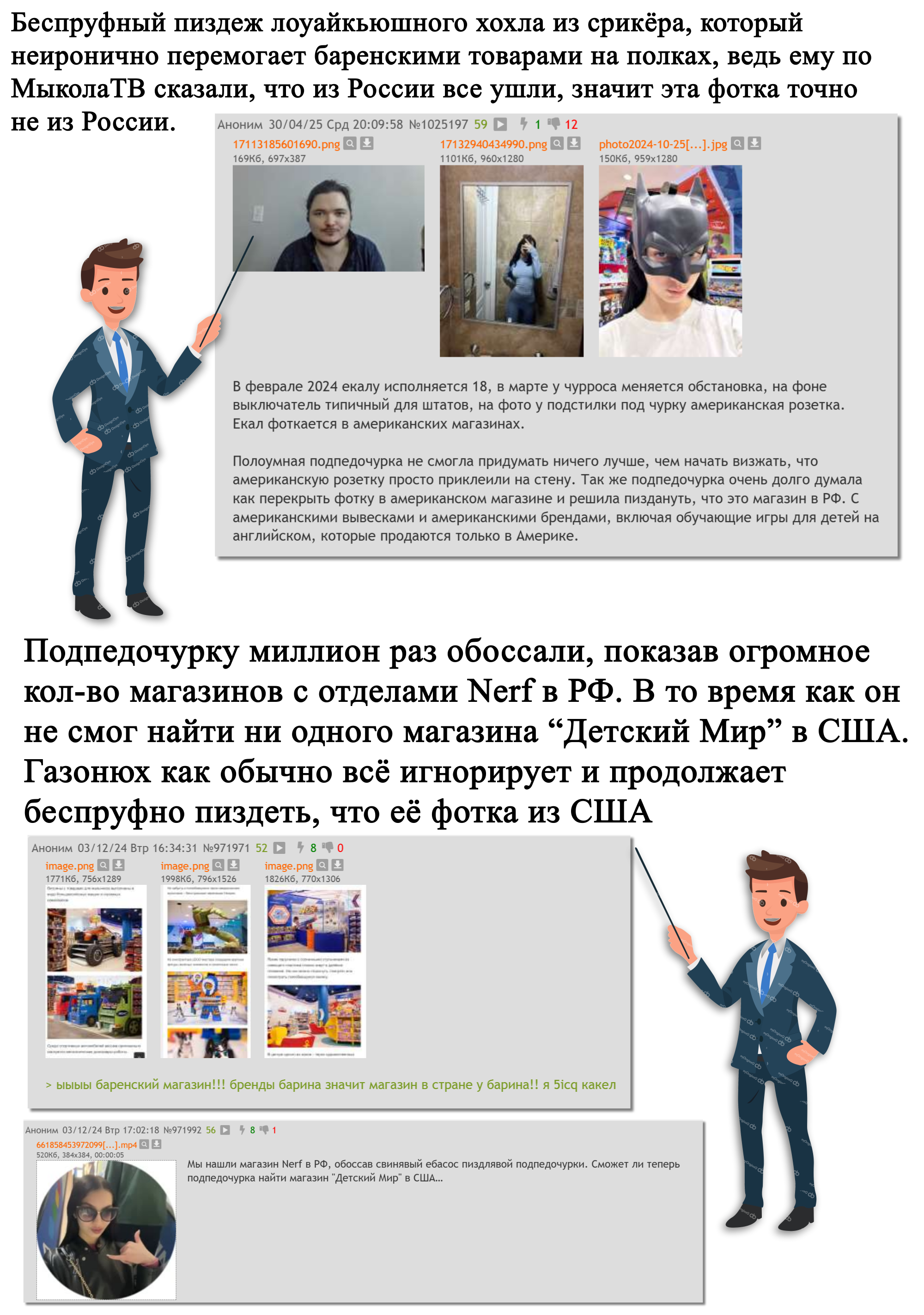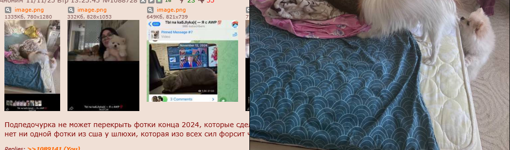 Подпедочурка не может перекрыть фотки конца 2024, которые сделаны в доме родителей в волгограде, кота в ноябре 2024, когда петух уже как год беспруфно кукарекал про сша. Ну и конечно же не может объяснить почему нет ни одной фотки из сша у шлюхи, которая изо всех сил форсит что она в сша.