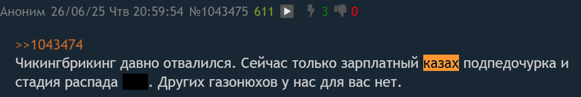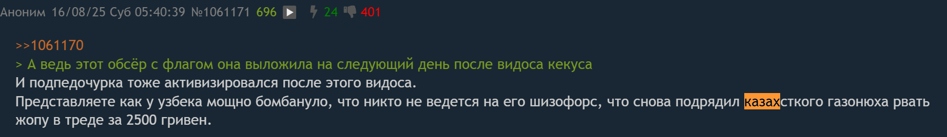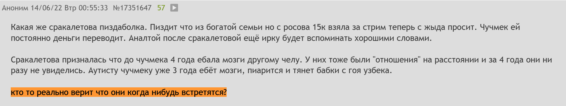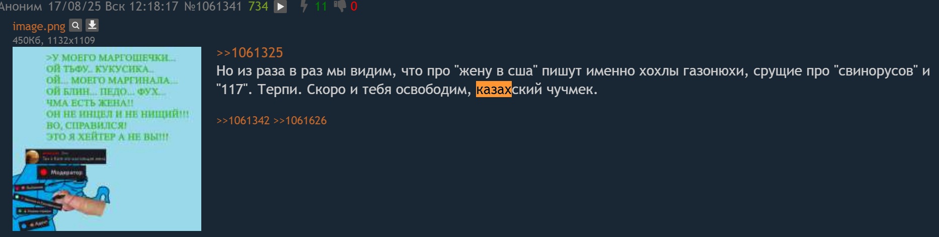 Как же потешно срикерная казахская шлюха форсер шизы про жену перефаршивает. Её спалили еще год назад, он затаил обидку и теперь под самым тупым предлогом решил перефорсить