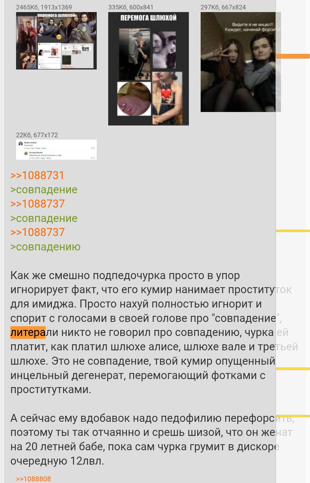 Как же смешно подпедочурка просто в упор игнорирует факт, что его кумир нанимает проституток для имиджа. Просто нахуй полностью игнорит и спорит с голосами в своей голове про "совпадение", литерали никто не говорил про совпадению, чурка ей платит, как платил шлюхе алисе, шлюхе вале и третьей шлюхе. Это не совпадение, твой кумир опущенный инцельный дегенерат, перемогающий фотками с проститутками.