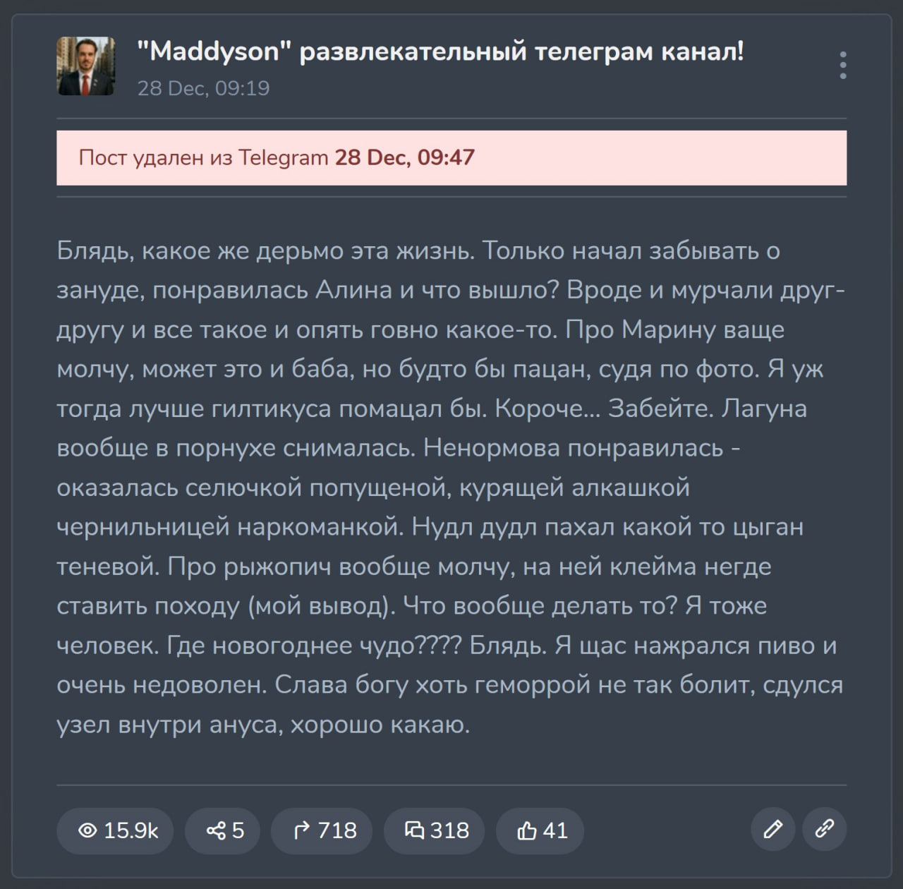 Кто-нибудь сохранил пост который начинался со слов как он начал забывать зануду, и теперь ему алина понравилась, но нихуя не получилось? Пост полурофельный вроде как , но он сразу его снес.