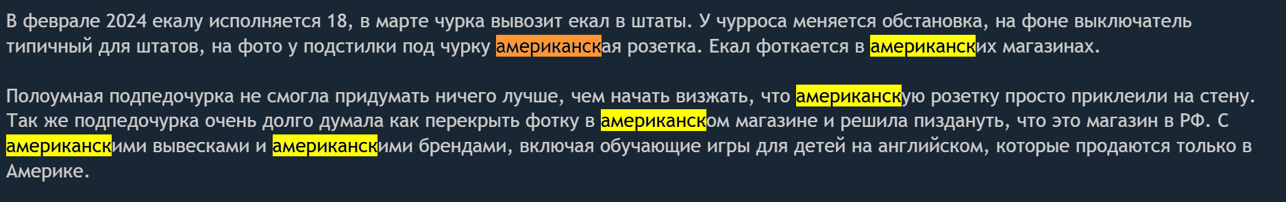 Столько шизопаст подпедочурки с форсом про сша, столько визгов про "АМЕРИКАНСКИЕ МАГАНИЗЫ", "АМЕРИКАНСКИЕ РОЗЕТКИ", "АМЕРИКАНСКОЕ ХРЮЧЕВО". Столько лет срикерный дегенерат форсил пиздаболию сраколетовой, а она в итоге взяла и всё заруинила, кекв