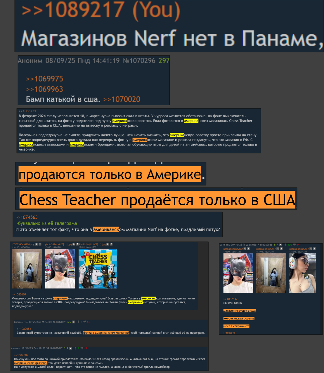 Подпедочурка чмодер тащит в тред левые фотки из канала Сраколетовой в ТГ и пытается выдавать их за пруфы. Шлюха постит их у себя специально, чтобы газонюхи думали, что она живет в США.