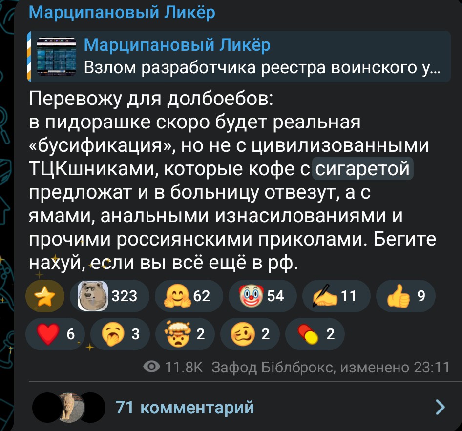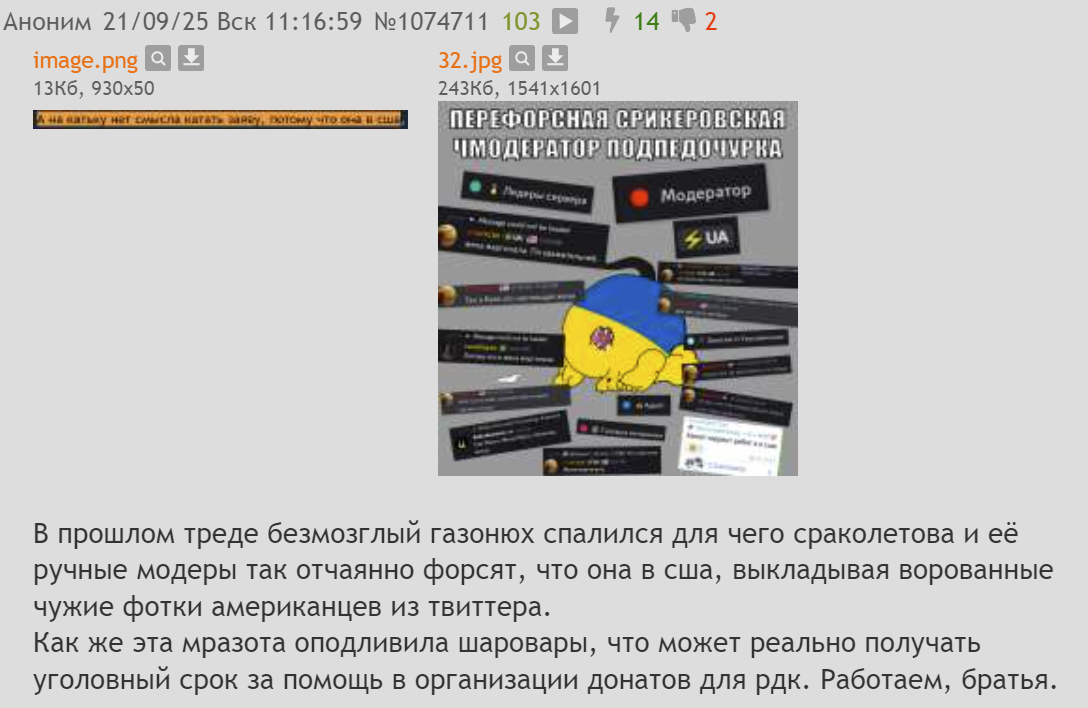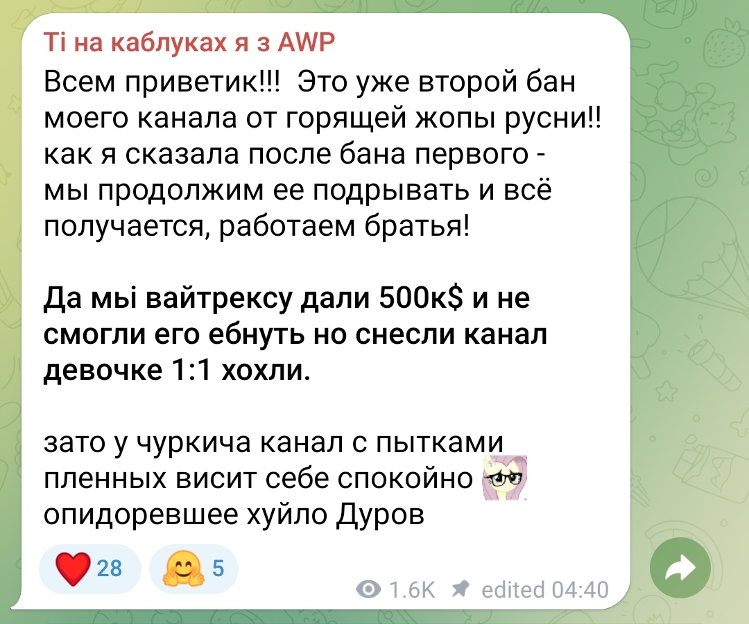 >>1105001 >>1105008 Короче, надо просто репортить каждый мало-мальски провокативный срикёрный пост, каждого газонюха в чате, каждый день. Мочерация в телеге работает через очко, до мочи доходит кайнд оф 30% репортов, поэтому надо тупо бомбардировать пидорятню ковровыми жалобами. Как-то раз таким образом срикёрные газонюхи скоординированно снесли Кванче чат в КБ. Если мы сможем уебать срикёр, или хотя бы их чат, то у существования этого каловайпнутого копротредика появится смысл.