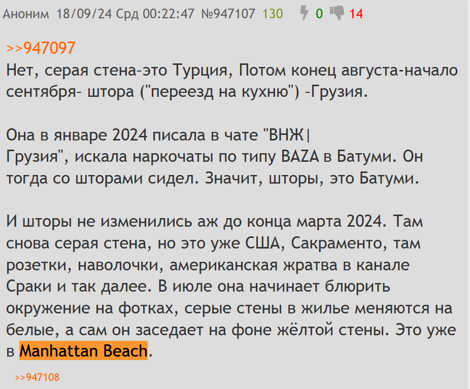 Методичка перефорсного хуесоса тут же поменялась. Пробитый сначала начал визжать, что на фотке Carl's Jr в Волгограде, но после поста с локацией в Панаме методичку пришлось корректировать. Согласно новой методичке, Екал не была всё это время в Волгограде, про который подпедочурка кукарекал несколько лет, теперь она оказывается жила в Панаме, а "нищий узбек, живущий с мамкой" оплачивал ей там жильё и её ёбырю. При этом в край запиздевшийся дебил продолжал кукарекать, что фотка в Нерфе была сделана в Волгограде.