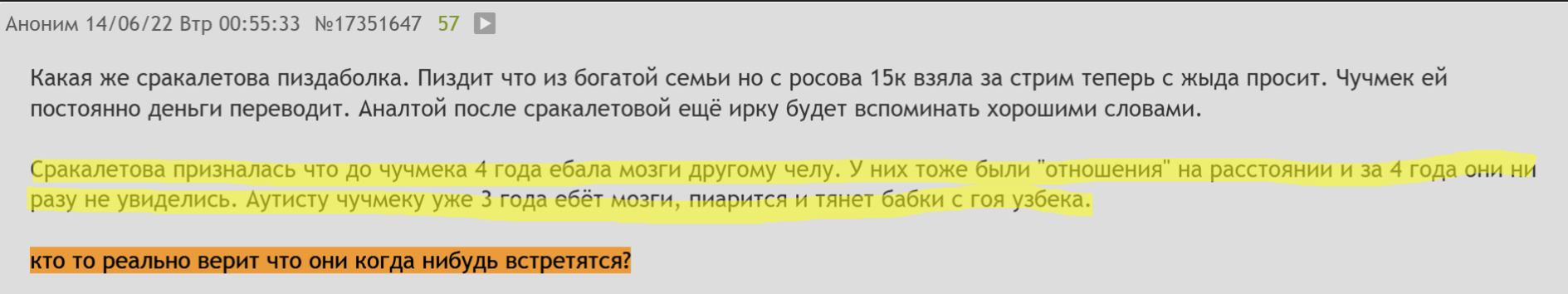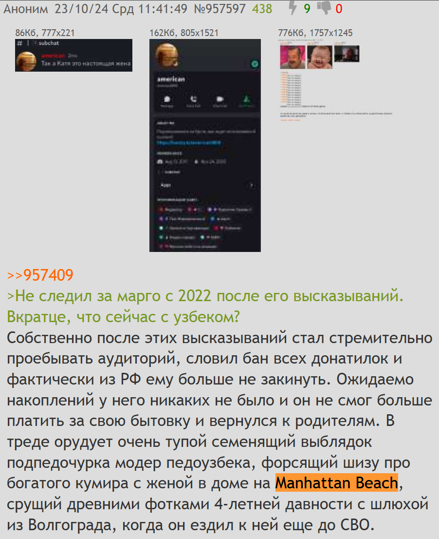 Аноны всегда угарали над нищим инцелом узбеком куколдом, которого Екал разводит на бабки на расстоянии и никто не подрывался и не перекрывал "вреееетии" и не срал шизой про "жену в сша". Подпедочурка пришел где-то в 2024. Особенно активно стал перекрывать в апреле 2025, когда вышел видос Кекуса на пол ляма просмотров, обоссывающий форс узбека.
