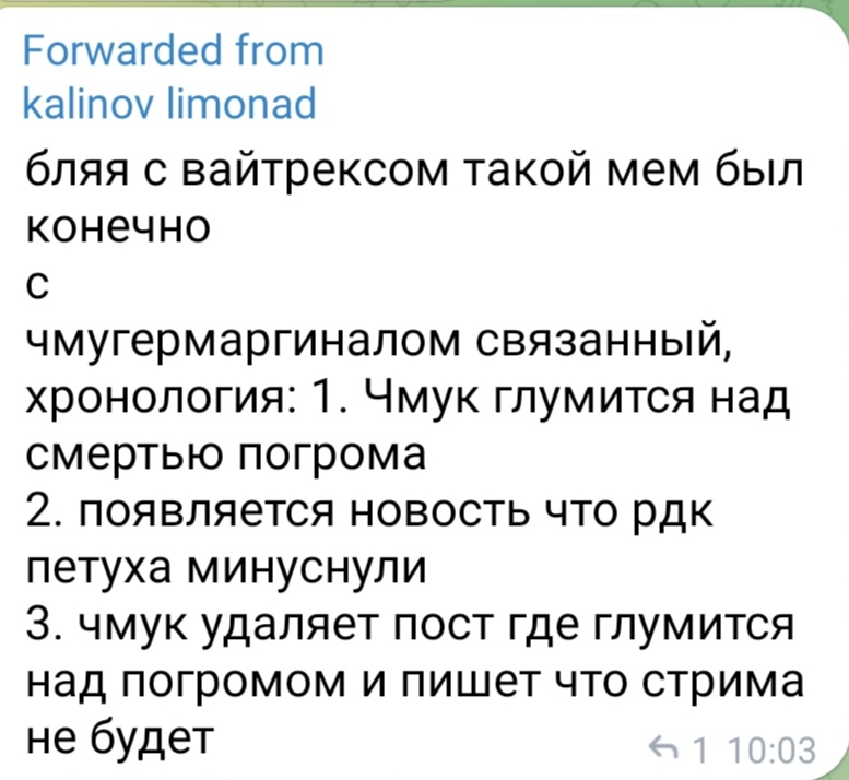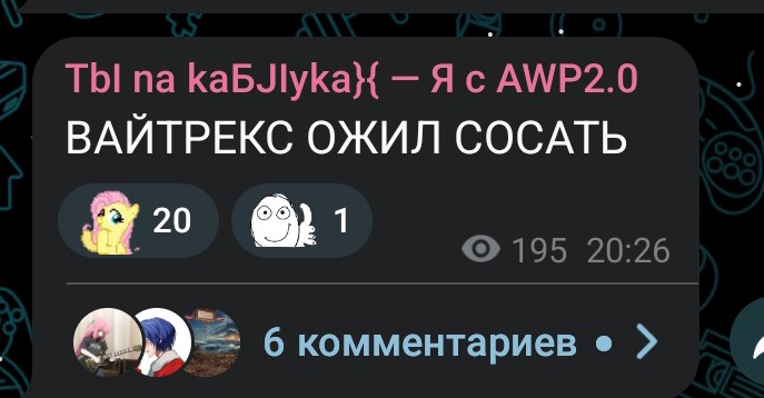 >скрыто форсила >скрыто форсить Ходить на стримы росова с овер 1к онлайном и визжать "ЙА ДЕВУШКА МАРГИНАЛА" это не скрытно, форситься в тг и дискорде с одобрением админов это не скрытно, выкладывать протухшие фотки с узбеком из 2022 во всеобщее обозрение это не cкрытно, заставлять подсосов клепать хайлайты про ДЕВУШКУ МАРГИНАЛА на овер 50к просмотров это не скрытнo, отправлять воздушные поцелуи "жене" прям на стриме это не скрытно, включать видос сакрамара, смотреть его от начала до конца с шизой про жену, это не скрытно, перефорсная подпедочурка.