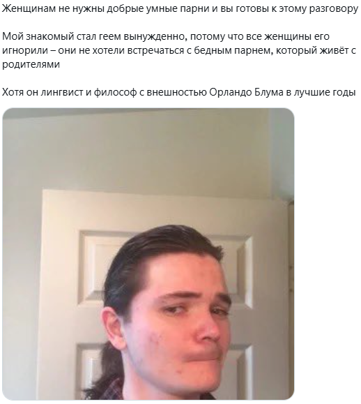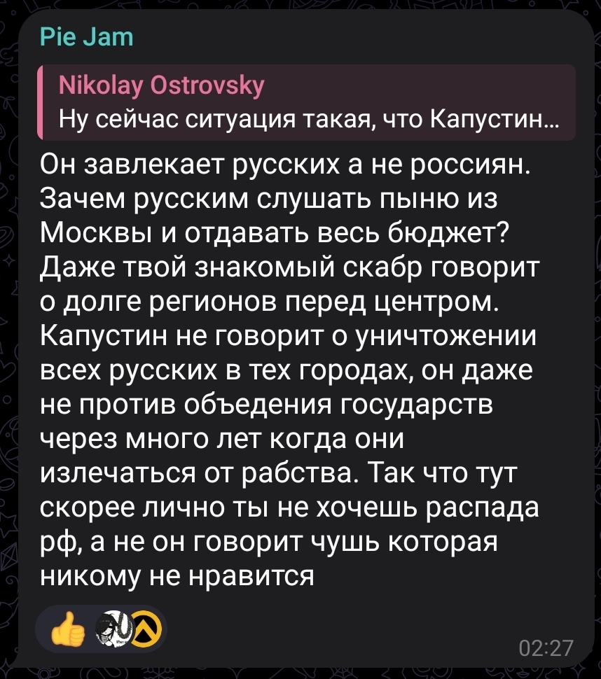 >>1105025 Типичный продукт "впитывания" политвзглядов через кумира, тусовочку и т. д. В целом, Островский и Сороколетова–одного поля ягоды (просто она совсем тупая). То есть они свои взгляды осмыслить не пытаются. Сказал Сармат/Артамонов/окружение, что вот это–хорошо, а то–плохо значит, так и есть. Получу лайков за свои посты
