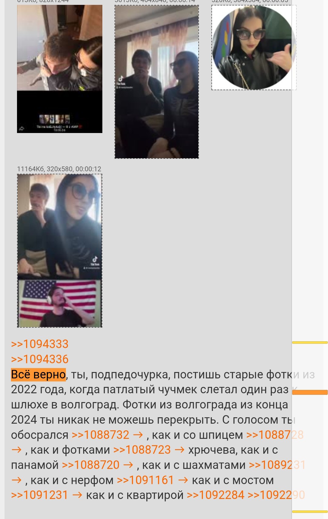Подпедочурка тащит в тред левые фотки из канала Сраколетовой в ТГ и пытается выдавать их за пруфы. Шлюха постит их у себя специально, чтобы газонюхи думали, что она не живёт с Чмом. Все "пруфы" подпедочурки это старые фотки екала школьных времён.
