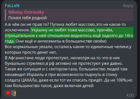 Насчëт Островского тут тяжело сказать, потому что он довольно давно вне РФ находится, а вот в чëм выгода Сороколетовой от развала РФ, в чëм выгода Сороколетовой в повышении вероятности прилëта в дом еë родителей за еë донаты, в чëм выгода ей в смерти еë родителей–мне не понять. Что они ещë хуже станут жить от развала выгода? В чëм лично еë выгода?