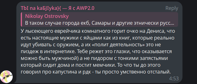 Если кто не понял, при чём тут вообще запястья, поясняю: это спизжено у Тесака. Ещё во времена Формата Тесак обвинял соратников ДПНИ, что у них бицепсы меньше, чем у него запястья, и ни на что они, кроме как писать в интернете, не способны. Тесака, который до первого срока не стеснялся пиздить кого попало, ещё можно понять с такими заявлениями. Этот же разжиревший дрищ сам себе на лицо пускает мочу, когда кому-то подобное предъявляет.