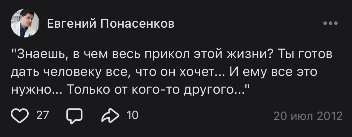 >>1100040 Ежевика, ты неправильно поняла написанное. Это стандартный гэг по всему СНГ, а мб и по миру, когда родственники/знакомые представляются как люди, вечно задающие вопросы "когда женишься?", "уже женился?", "когда дети?", фраза про развод там использовалась как шутка-антипод фразе "когда женишься?", проще говоря, гэг говорит, что нормисы всё сводят к "женился? уже развёлся? не умер?" и т.п. Надеюсь, понятно объяснил, и попрошу не вносить путаницу в нашу науку. А что касается страницы в ВК, глаза на лоб лезут, логика понятна, что это бородатые годы, но всё равно не верим, не может же гений сидеть в ВК, даже если тот был в те годы чуть ли не единственной соцсетью, не верю!