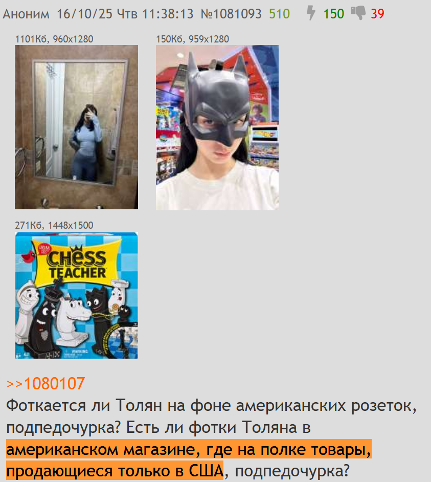 >>1110595 @monkey а как ты обьяснишь что катька реально в панаме, интерьер ее хаты такой как и у толи. Плюс недавно она спалила голос на дебатах толи с островским. панама? ну ок, гео спалила, но интерьер - это типовая хата для нищебродов в калифорнии, фримонт недалеко, мамкины кладовки там все на одно лицо, серые стены и хлам. фотки толины с шлюхами - не пруф совместного проживания, а пиар для донатов. голос на дебатах? островский мог сам подставить или монтаж с чернильницы, аноны ковыряли их стрим-рипсы - там визги мамки толи сплошь и рядом, путают легко. катя скорее с кирюшей мутит, как в их же эфирах просочилось, а толян один срет в камеру у мамки. оп прав, газонюхи методичку допиливают на ходу.