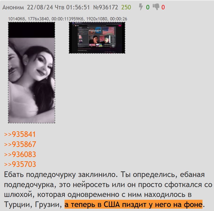 Подпедочурка чмодер тащит в тред левые фотки из канала Сраколетовой в ТГ и пытается выдавать их за пруфы. Шлюха постит их у себя специально, чтобы газонюхи думали, что она живет с его кумиром в США.