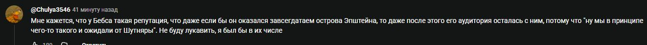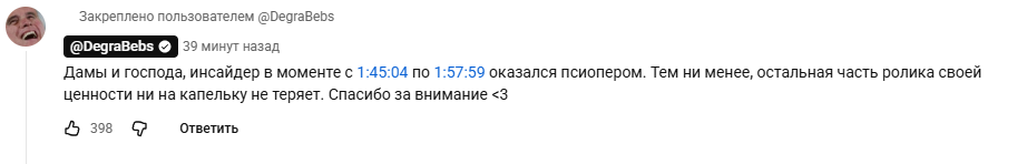 бля, а мне понравился эпилог бэбса в конце. ну там где он опять обратился к аудитории и прогнал стандартную телегу: "дорогие мои дорогие, мы просто ютуберы. мы не ваши кенты, парасоциальные отношения отстой. вы лузеры, если нас считаете за свою братву", бля, вот эти прогоны у многих есть ютуберов и стримеров(стримеров даже больше) вот я не ютубер с доходом лям в месяц рубликов, мне наверно непонять, но ведь блядь - ты стреляешь по своим. у тебя среди топовых донатеров точно есть одинокий айтишник без друзей, который тебя смотрит и замещает общение таким образом, твои активные чаттерсы, особенно какие-нибудь нарезчики, они же тебя сука видят чаще, чем свое отражение в зеркале. ну вот нахуй некоторые эти ютуберы хуярят по своей кор аудитории, по самым активным? типы, у кого есть достаток в общении не будут занюхивать подкасты или стримы(максимум нарезки, и то - самые хайповые) мб я сужу по себе: пока я работал на одной работе и у меня не было вообще знакомых, даже с коллегами не общался, я активно занюхивал контик ютуберов и стримеров, но стоило мне поменять работу и обзавестись хотя бы парочкой знакомых-коллег, я сократил просмотров всего этого парасоциального дерьма вдвое, а в чатах вообще перестал срать. т.к. а нахуя.