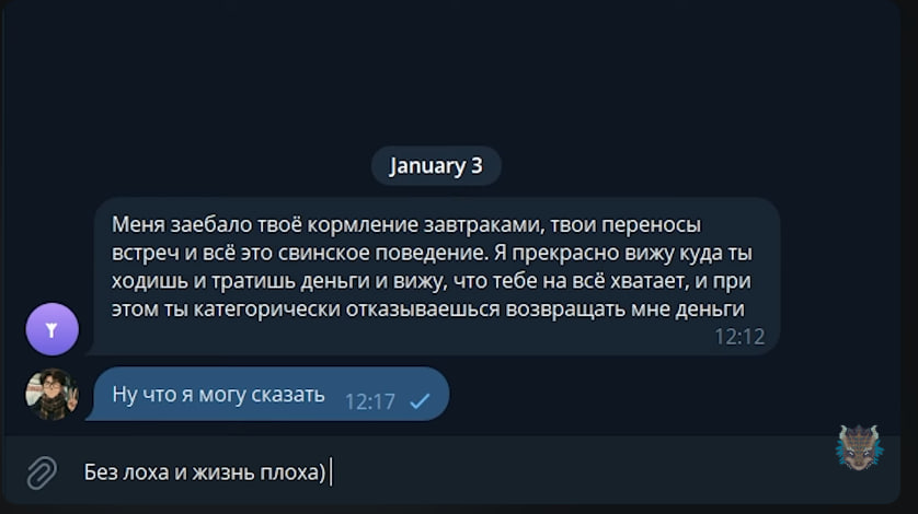 Но главный лох этой истории всё равно Зио. Он натурально дурачок, который пытается на двух стульях усидеть, но с нюансом. Пример со стульями обычно приводят, когда человек хочет получить профит с двух сторон. Зио же, судя по всему, хочет искренне примирить две враждующие стороны, ибо нормально общается и с теми, и с теми. Однако, результат у таких мувов обычно всегда один - тебя нахуй посылают и те, и те со словами "ах так ты за него а не за меня иди нахуй тогда". Это же ждёт и Зио, скорее всего - обосрут и виноватым выставят.