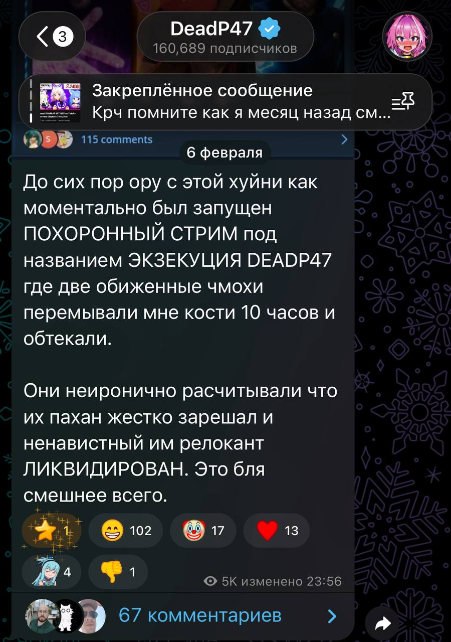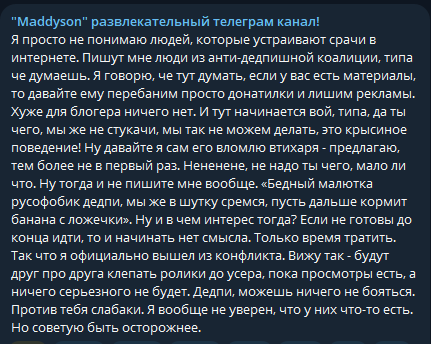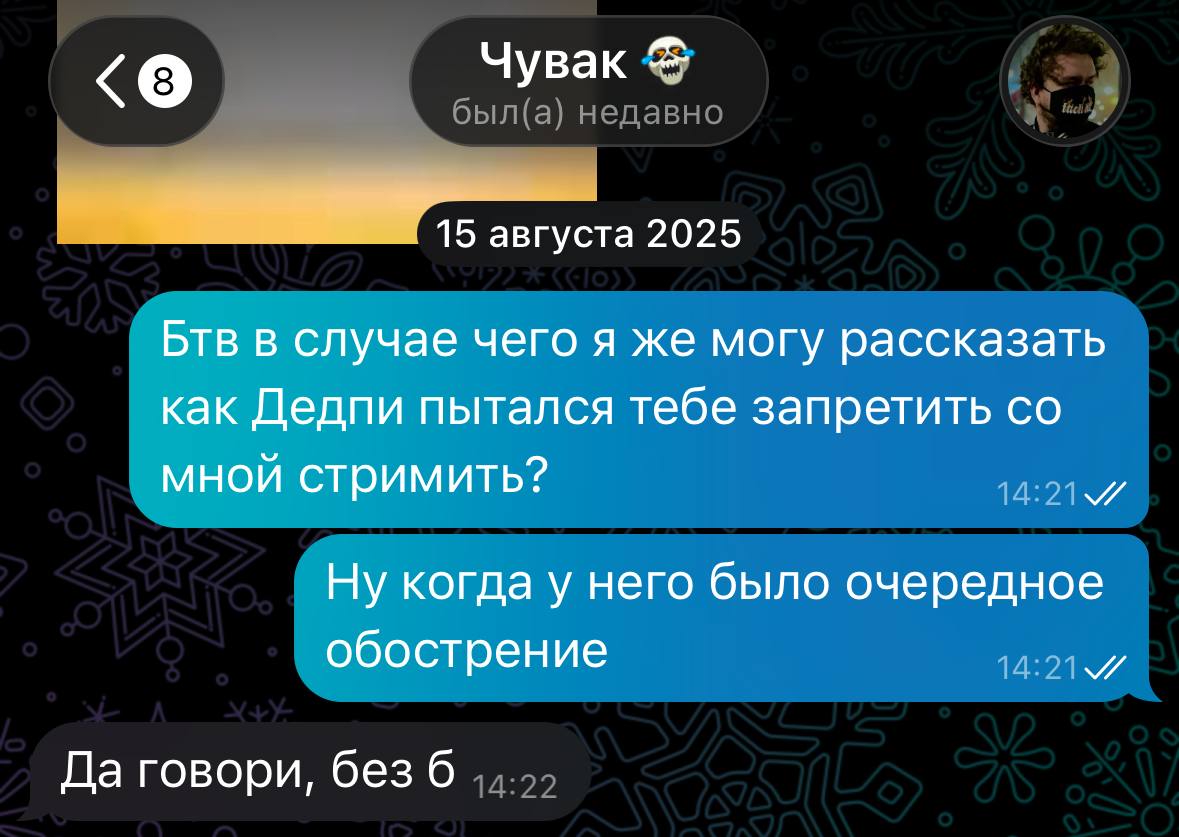 Ещё проорал с истории про Мунлайтера. "Бляяя чел срал постами про шоп, он чё, не мог со мной связаться?", а потом сам говорит, что в больничке лежал, и до него не дописаться было. Так нахуя ты тогда предъявляешь за то, что по твоим же словам было сделать и так невозможно? И в этом весь дедпи. Ему 30 лет, а обижается, как 13-летняя девочка, выдумывает нелепые противоречивые оправдания. И с Топазом такая же жижа. Просто попался удобный аргумент про "он воевал он не врёт", а вот Чигур Банан никого не убивал. На этом всё и застопорится.
