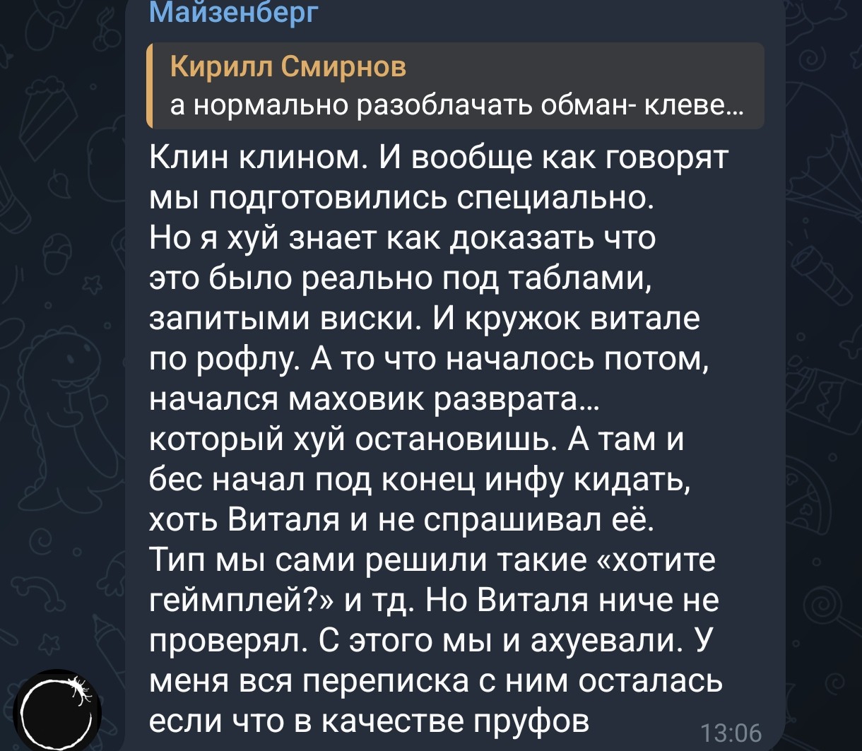 >>1115781 > дурачок на аргоне просто дождался сливов, посмотрел, че там конкретно и заснял "псиопописание", где дословно процитировал переписку, типа это он сам писал. такая хуйня за минуту клепается Это были бы гениальные мувы, но только до выхода разоблачения он скинул инфу про вбросы минимум двум степашкам Майзенбергу и Кекусу, второй в чате зио активно срал намёками.