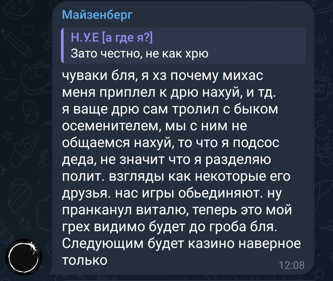 И да, учить зрителей байками про гнилых недоподсосов когда ты сам пытался подсосаться к Илье Мэддисону и жестко пригорел когда он в декабре послал тебя нахуй вместо инвайта на NASRAL 2025 (пригласив туда Глада Валакаса) это мое почтение.