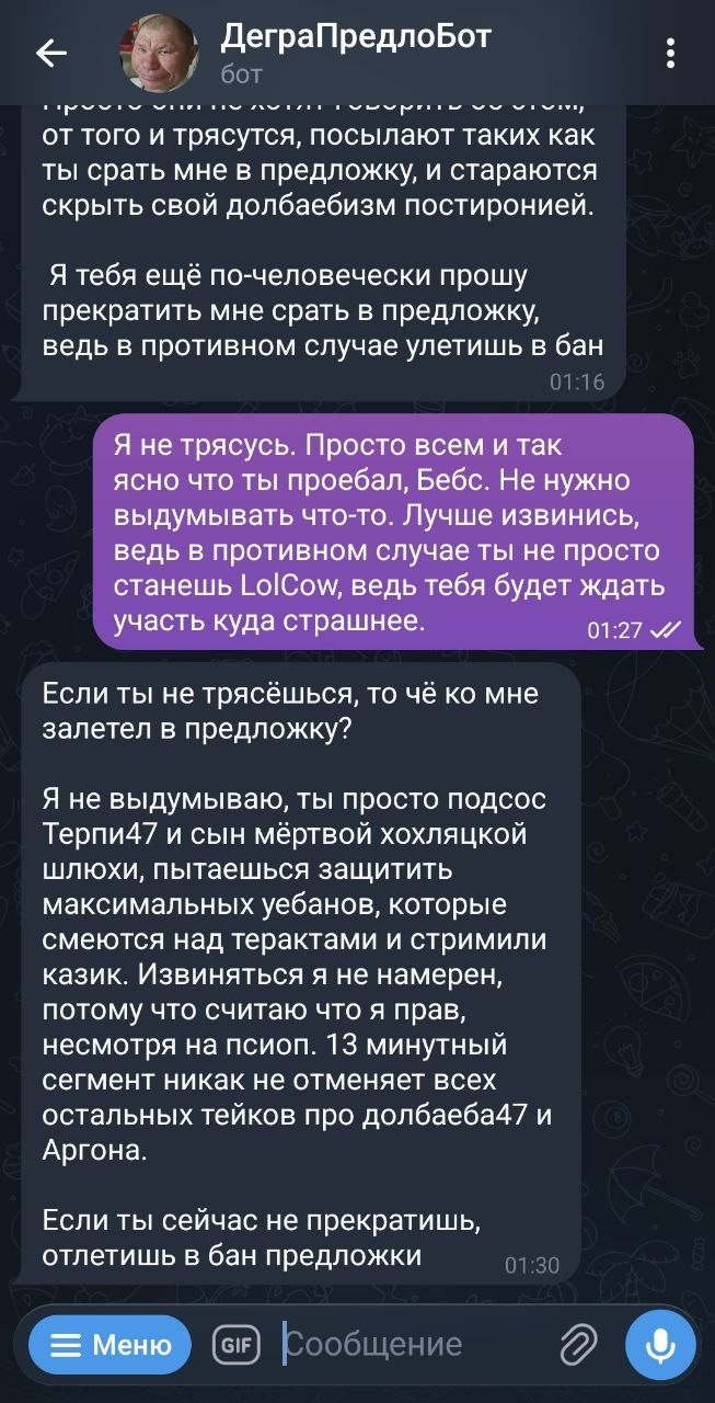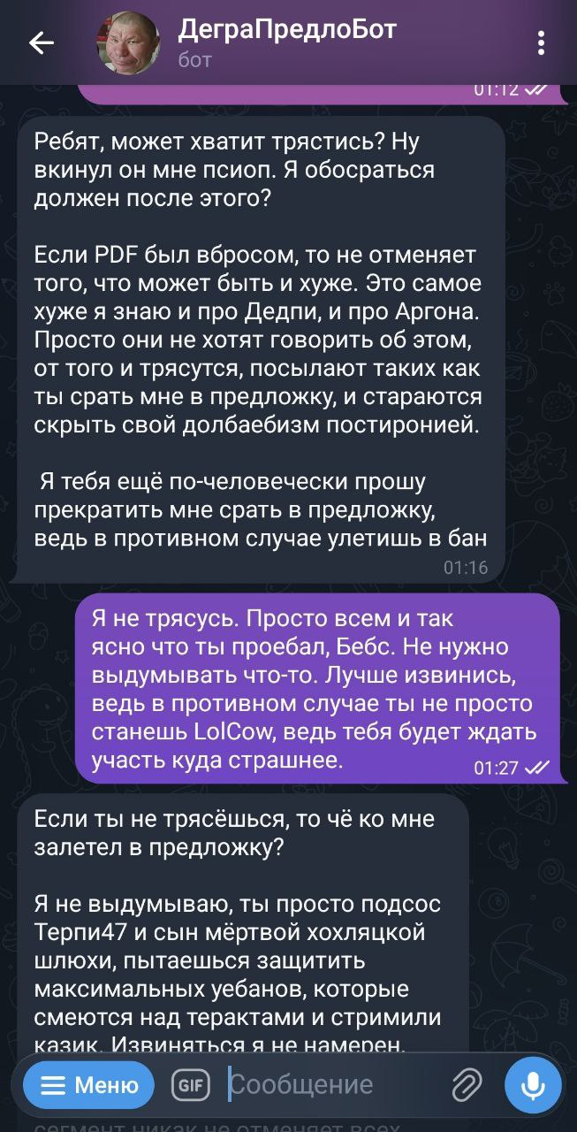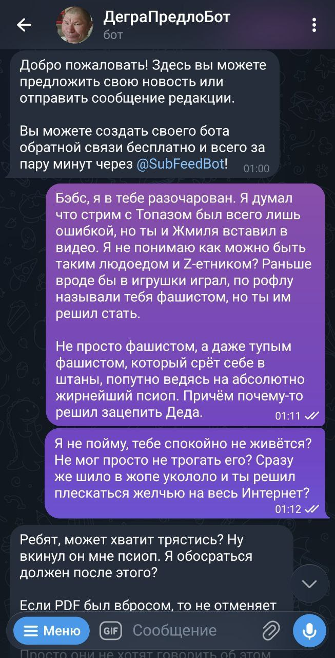 Щас свинявые подсосы ящерицы скажут что я демеджконтролю. Я молчу про то что 13 минут псиопа никак не отменяют два с половой часа остальной непсиопной инфы. Единственное чего аргон добился - наебал бэбэя. ВСЁ, прям всё. Как то что бэбэй повёлся на эту наебку показывает его в плохом свете, хз. Меня по жизни тоже наебывали бывало, блять всех наебывали, в таком мире живём, хуе мое. И эта наебка только подтверждает правдоподобность видоса, так как бэбэй вставил эту инфу в видос только после того как получил 100% прямые пруфы в виде переписок и голосовых, которые могут быть лживыми только в случае подделки их самим аргоном, что и произошло. Это вообще не показывает его ебанатом или крысой вкидывающей непроверенную инфу. Поверить в то что торчебес с хохлизмом терминальной стадии ещё и детей ебет и корешам компы ломает - можно и без пруфов. А аргон их старательно наклепал, итт уже шиз ахуел с подставленной в фотошопе даты на скриншоте.