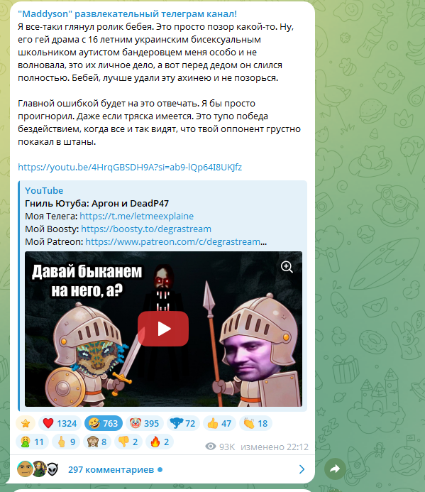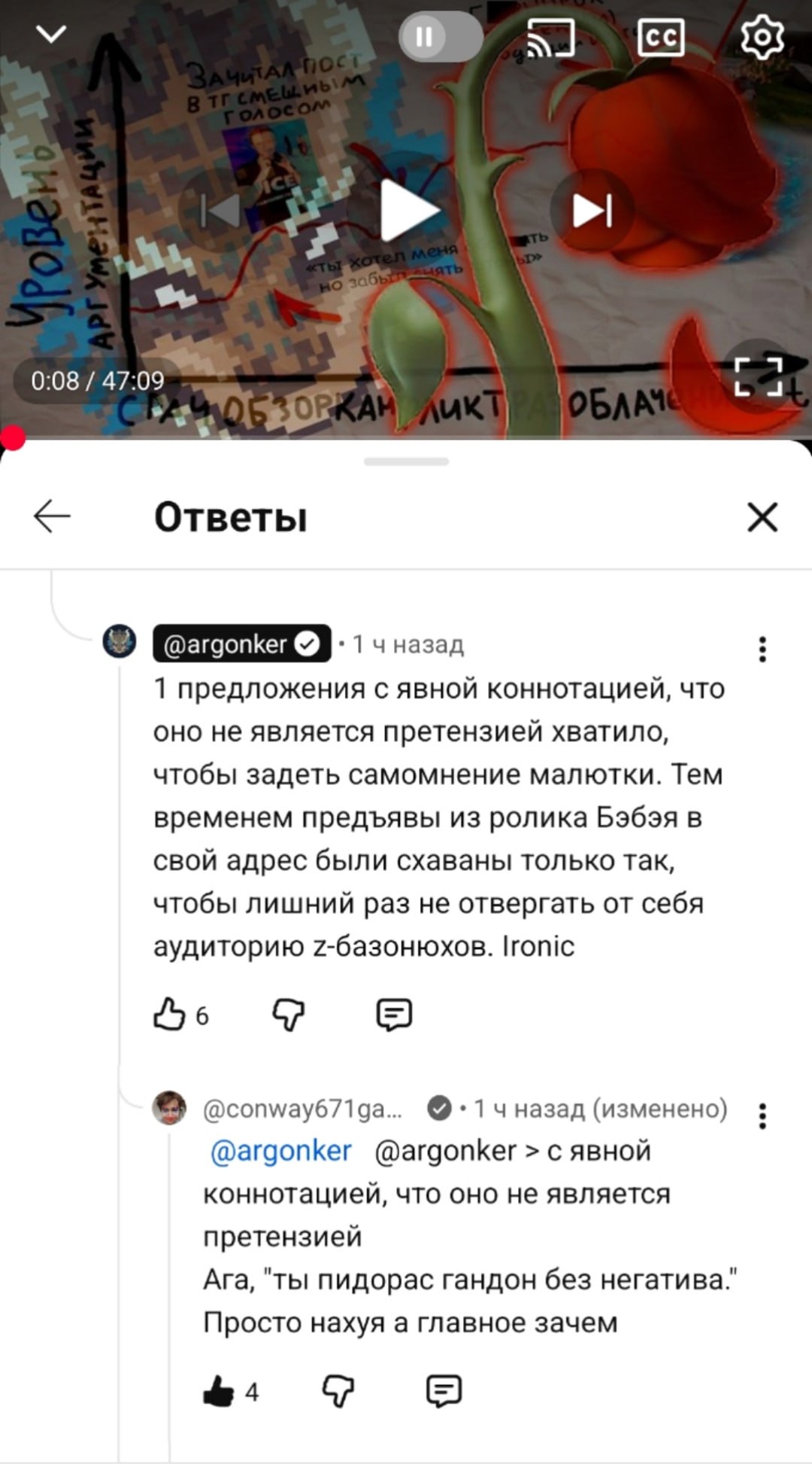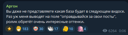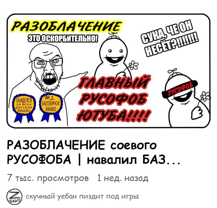 Считаю Аргон должен продолжать конфликт. Наш базовичок уже дропнул заранее записанную ответку, чтобы привлечь как можно больше трафика https://www.youtube.com/watch?v=qgp0_7K-IJk Задонатив Жмилю 400к на ВС РФ он почувствовал вкус крови и не успокоится, пока Леонид Р не получит иноагента, а Серега Банан экстремиста. Немного жестковато, но он из русского Харькова и поставил целью своей жизни давить русофобскую скотину, пока она не освободит его город от почти столетней оккупации.