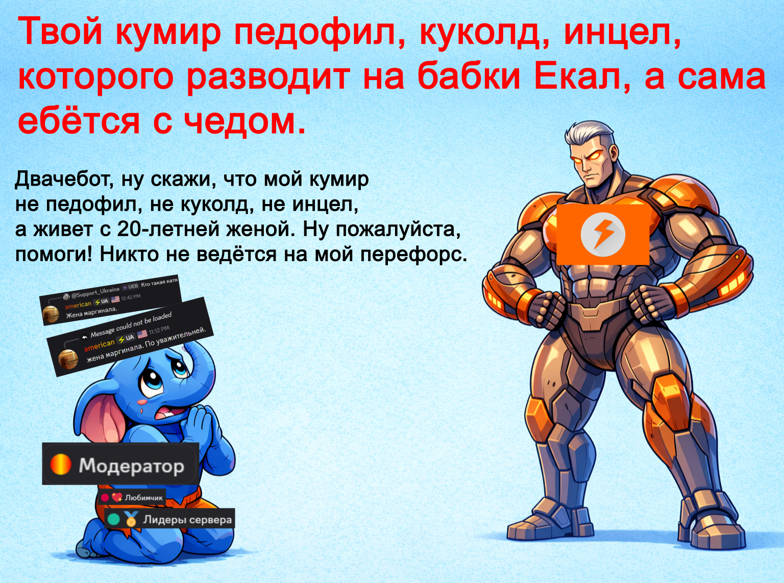 Мамбет реально думал, что бот встанет на его газонюшную сторону. Даже с попытками его обдурить, бот все равно пронюхал пиздеж и оказался неизменным в своей хейтероской базированной позиции.